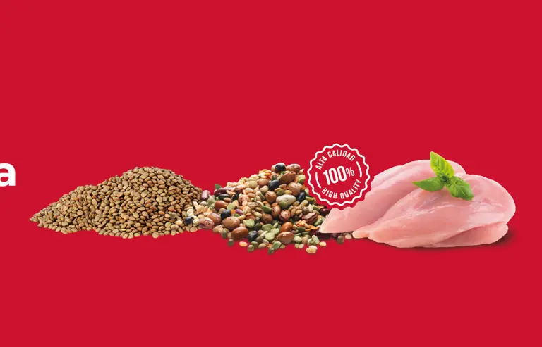 Carne y derivados de origen animal (pollo hidrolizado min. 15%), maíz integral, proteínas animales  deshidra- tadas, derivados de trigo, legumbres (min.11%), proteína de maíz, cebada malteada, grasa de ave, hidrolizado de hígado de ave, levadura de cerveza (Saccharomyces