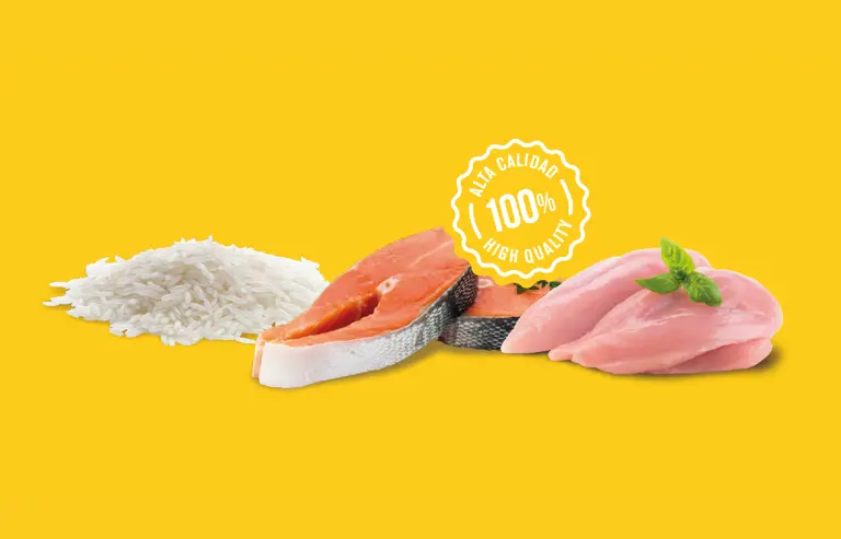 Hidrolizado de ave (pollo mín. 25%), maíz integral, arroz (mínimo 16%), proteína de maíz, hidrolizado de trigo, legumbres, salmón (mín. 7%), grasa de ave, aroma natural de hígado de ave, aceite de salmón rico en Ω3, levadura de cerveza (Saccharomyces cerevisae), fibras vegetales (lignocelulosa), complejo condroprotector (hidroclorato de glucosamina, sulfato de condroitina), taurina, manano- oligosacáridos (MOS), fructo-oligosacáridos (FOS), vitaminas y minerales.